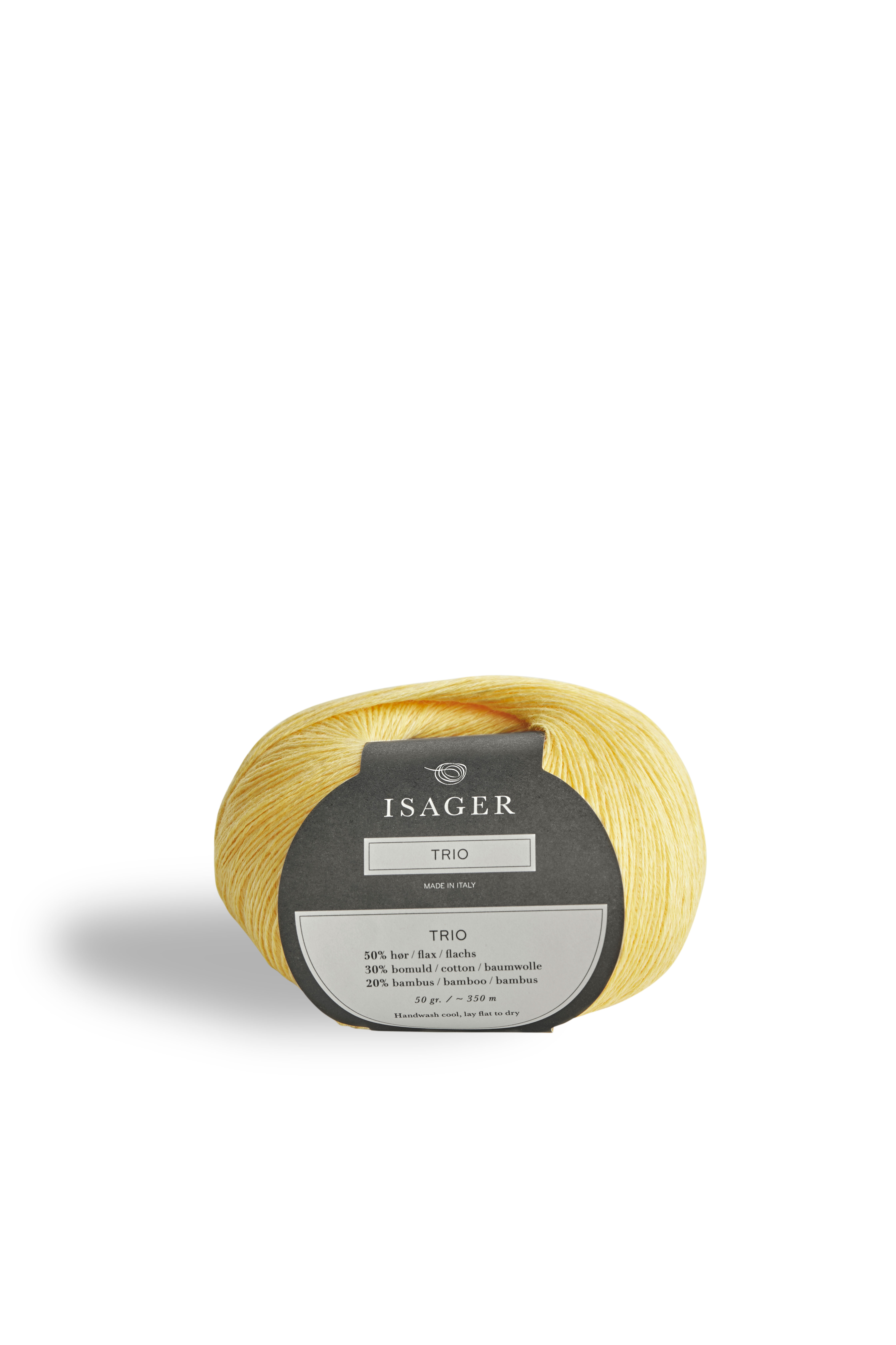 ISAGER TRIO 1 består af 50 % Hør, 30 % Bomuld og 20 % Lyocell (bambus). Garnet kan strikkes alene, med en, to, tre eller flere tråde, eller det kan strikkes sammen med de øvrige garnkvaliteter.