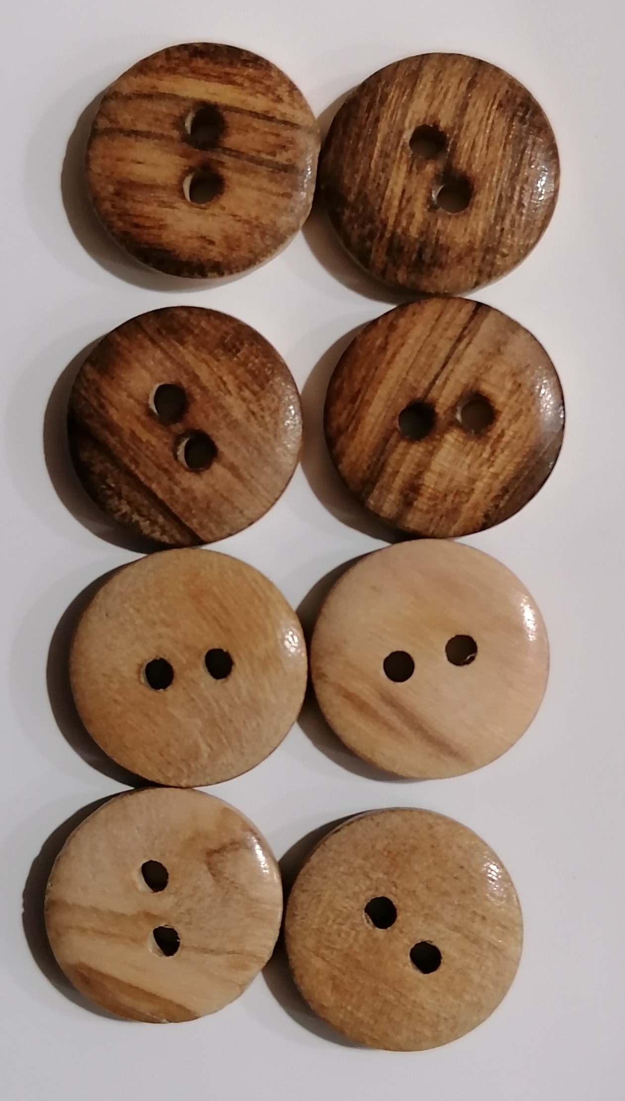 Træ knap m/2 huller - 2-farvet - lys på den ene side, mørk på den anden - ø15mm