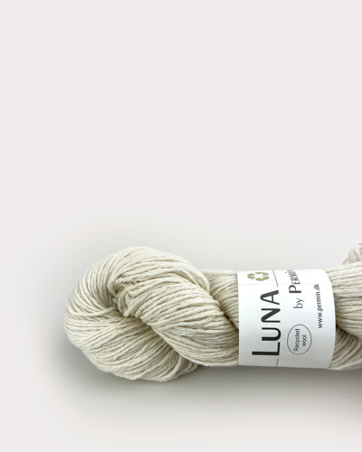 Luna by Permin er et helt specielt, og så alligevel velkendt garn. Luna er nemlig 100% recycled uld, lavet af kasserede fibre fra produktionen, der er blevet sorteret efter farve, hvorefter fibrene bliver kartet, spundet og vundet op til nye nøgler. Derved bruges der mindre energi, kemi og vand under forarbejdningen, da garnet ikke skal genfarves eller skylles.